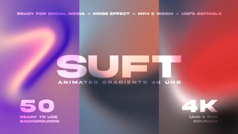 We offer ready-to-use HD videos in MP4 and WebM formats, compatible with all major browsers. Plus, you can export up to 4K Ultra HD from the Adobe After Effects source file, where you can customize any gradient to your liking. Change or create custom motion patterns, edit and customize colors, and use our video tutorials to add or remove noise, customize colors, and edit gradients.